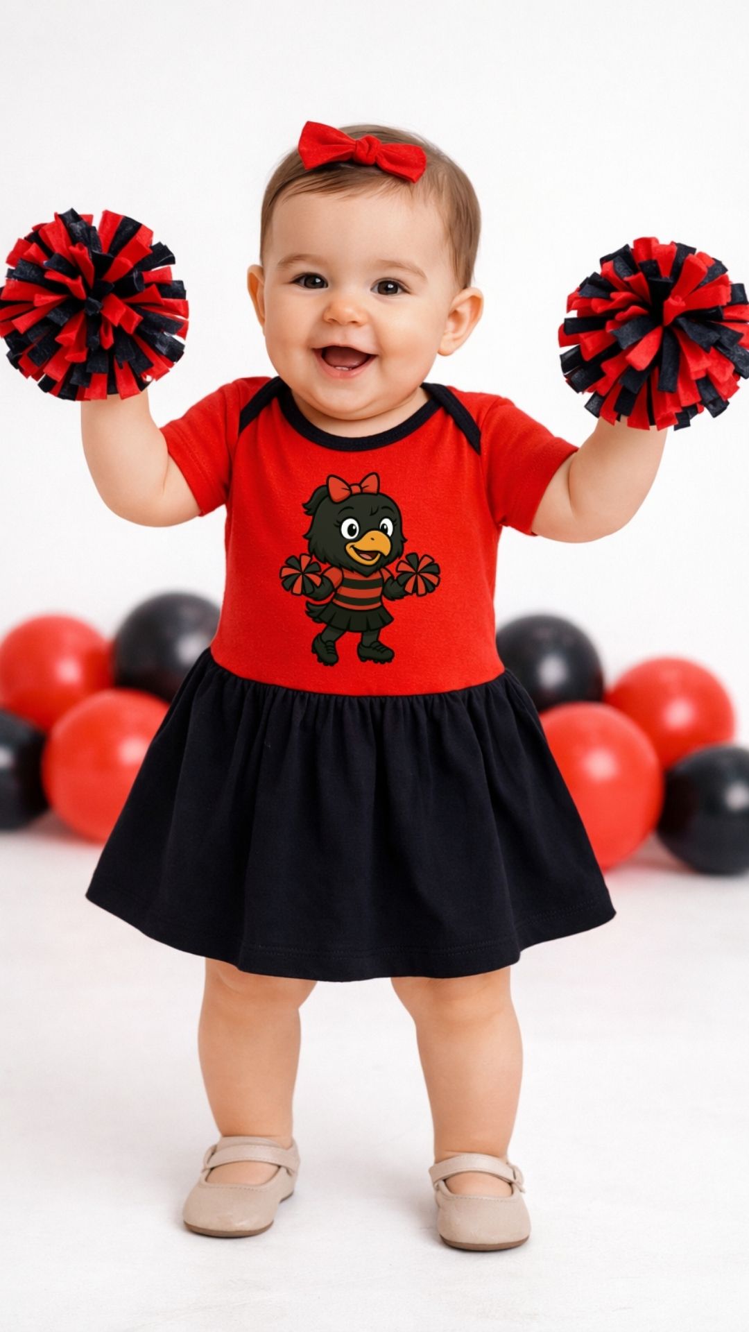 O Body Infantil Katitus Tema Futebol Vermelho e Preto com Saia Rodada é perfeito para as pequenas torcedoras que já nascem apaixonadas por futebol!
