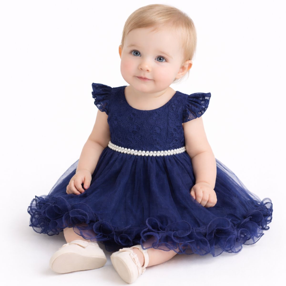 VESTIDO AZUL MARINHO BEBÊ RENDA TULE COM PÉROLAS